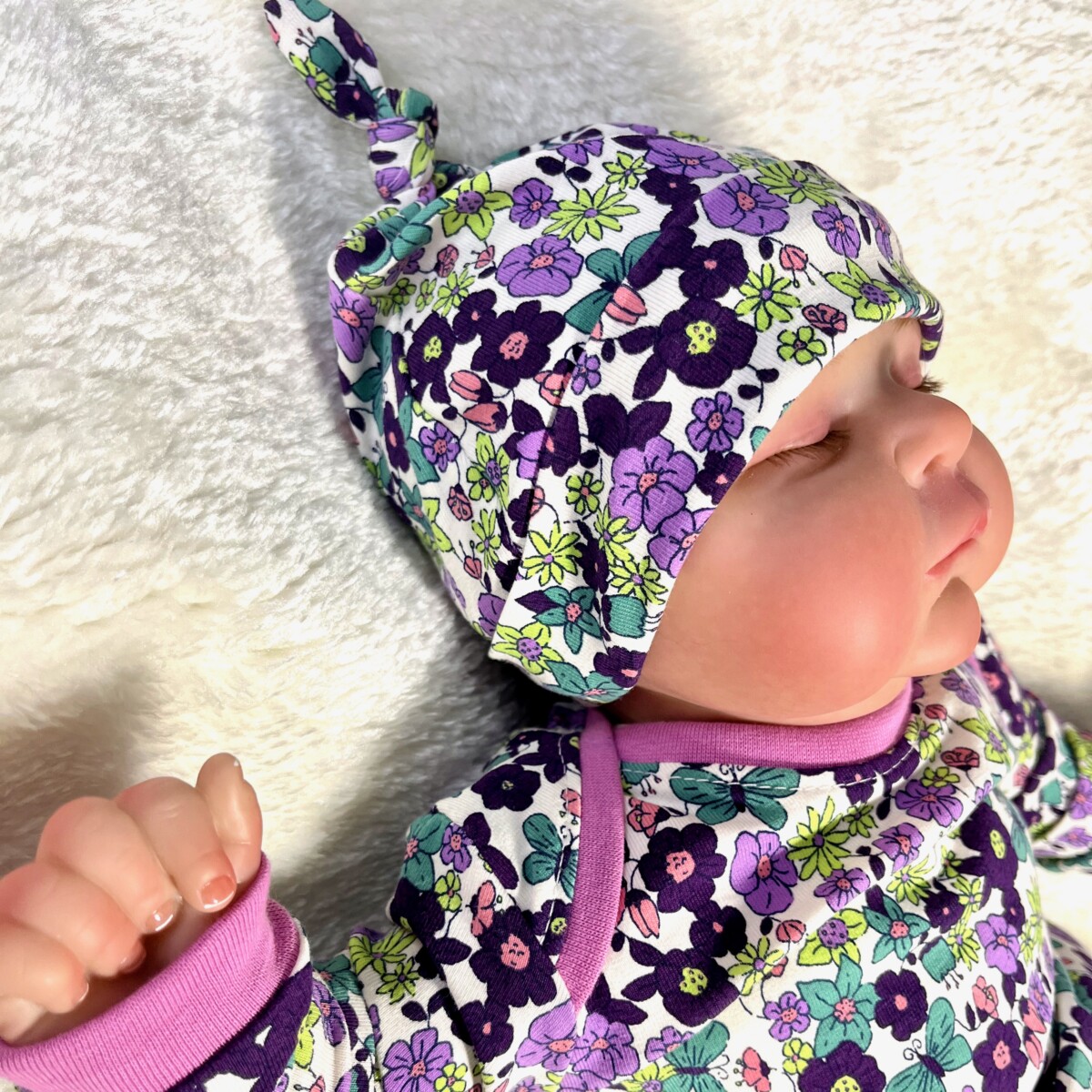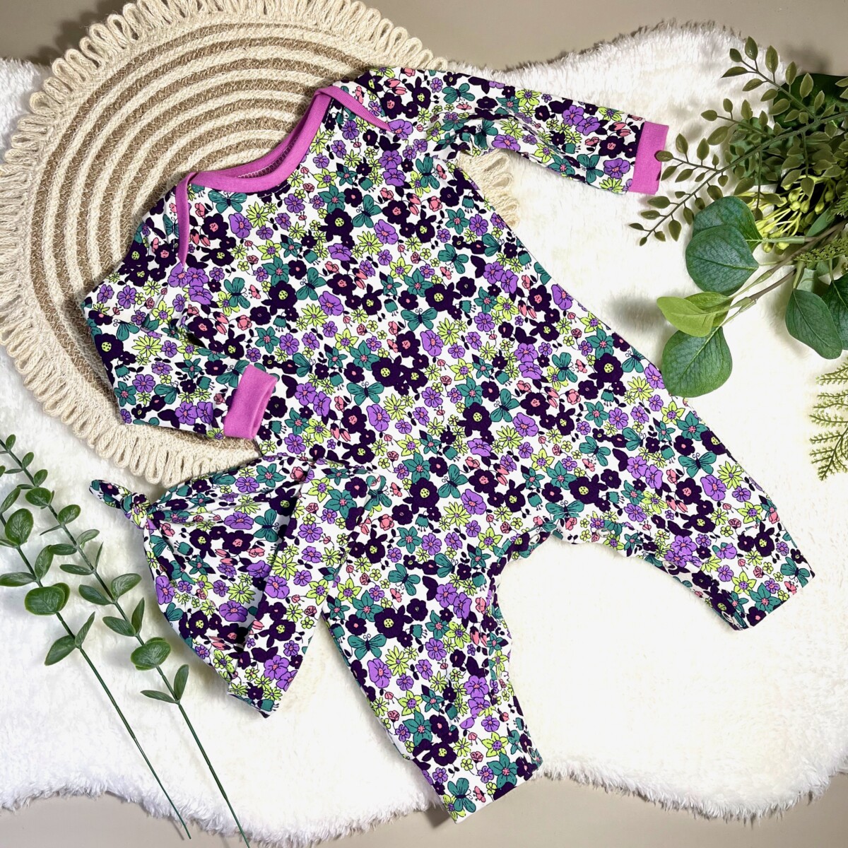 Beautiful floral sleepsuit and matching hat – a perfect gift set for a new arrival.