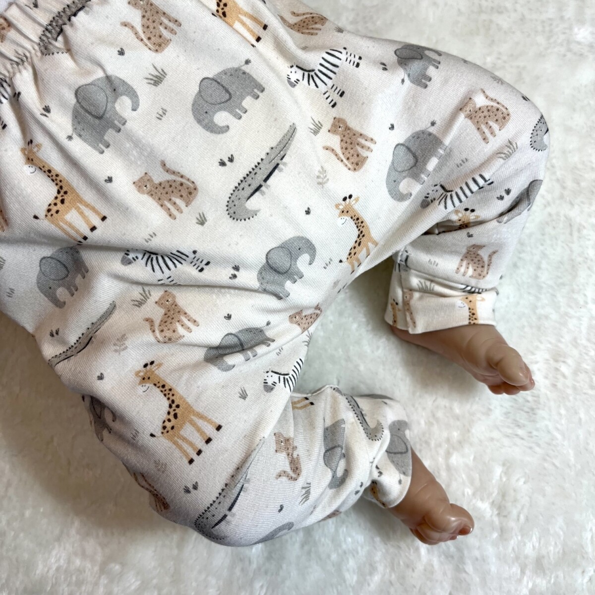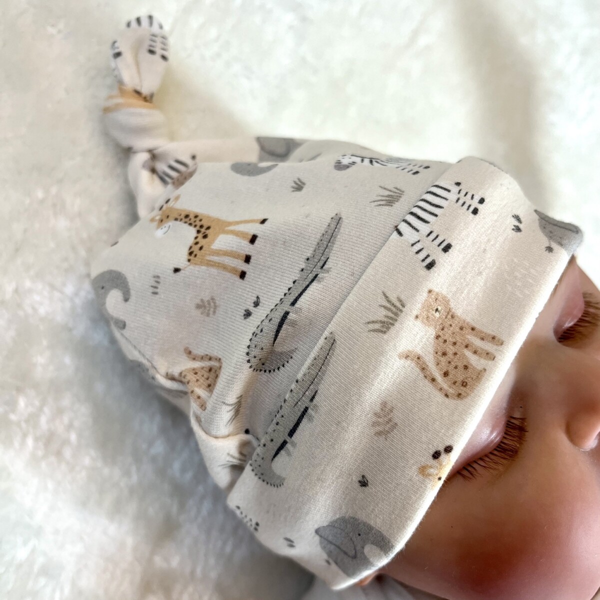 Beautiful safari animal print leggings, dribble bit and hat – a perfect gift set for a new arrival.