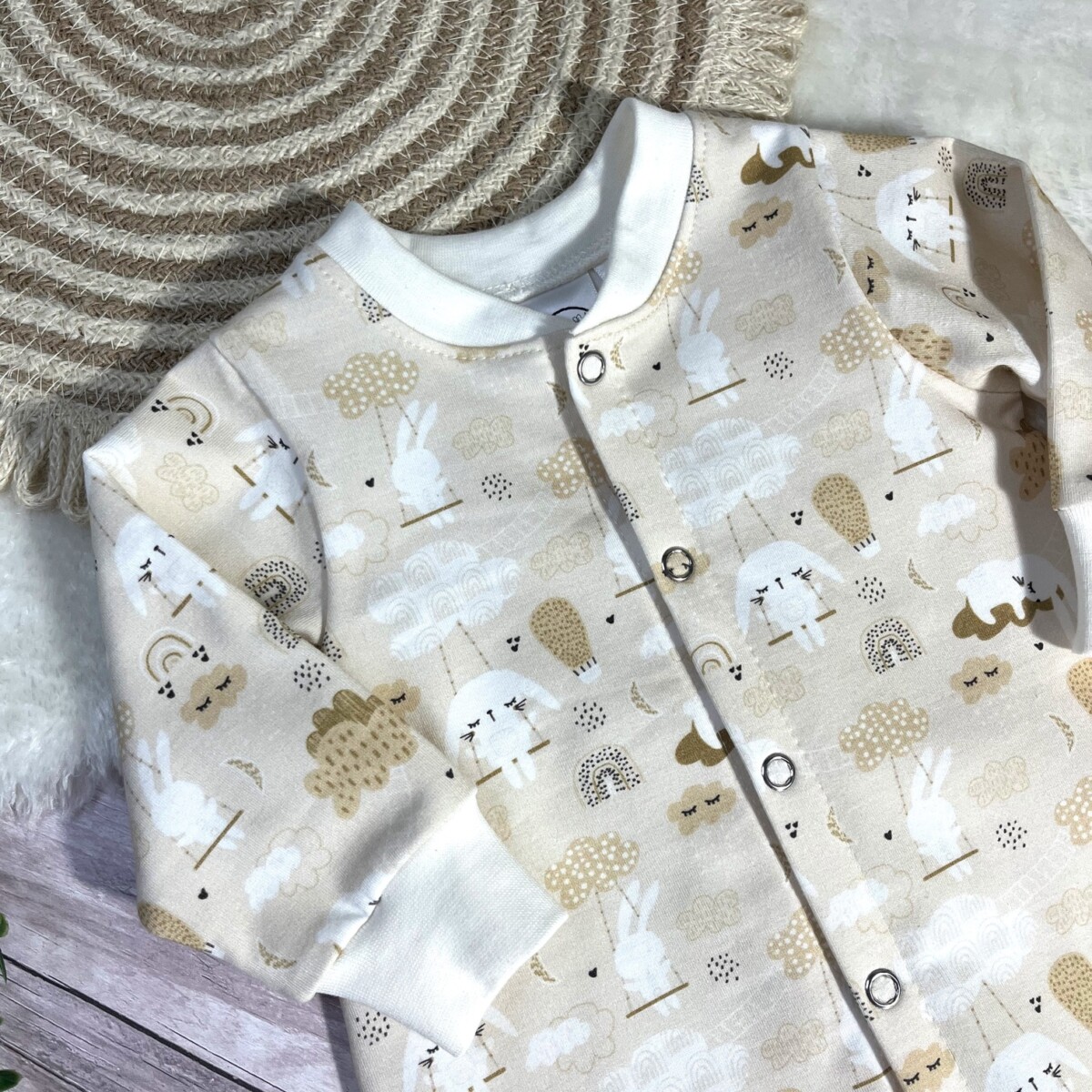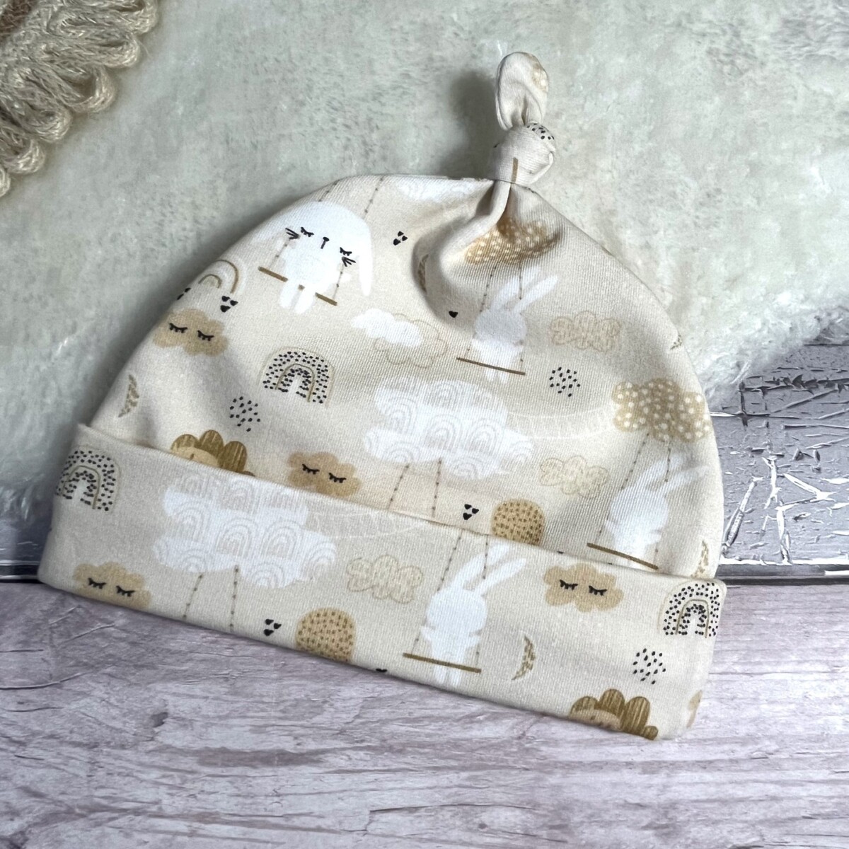 Adorable sleepy bunny print sleepsuit and matching knotted hat – a perfect gift set for a new arrival.