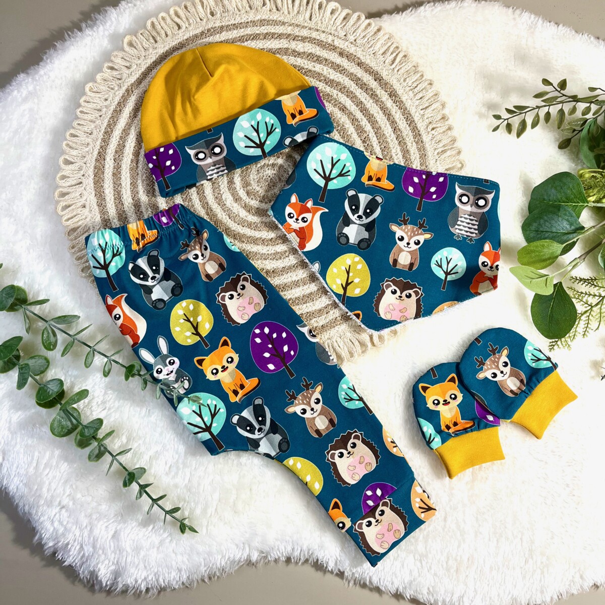 Adorable wildlife print leggings with matching dribble bib, hat and mittens – a perfect gift set for a new arrival.